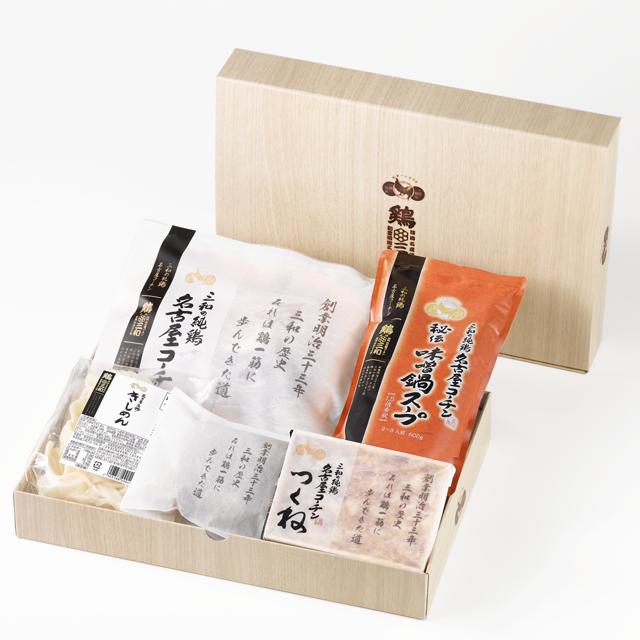 | 内容量 | 名古屋コーチン肉(250g) 名古屋コーチンつくね(100g) 名古屋コーチン入り団子(19g×8) 味噌鍋スープ(600g) きしめん(200g) |