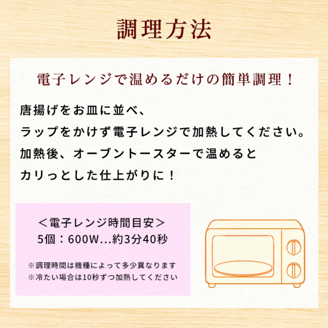 電子レンジ調理でご家庭で簡単に鶏専門店の唐揚げがお召し上がりいただけます。